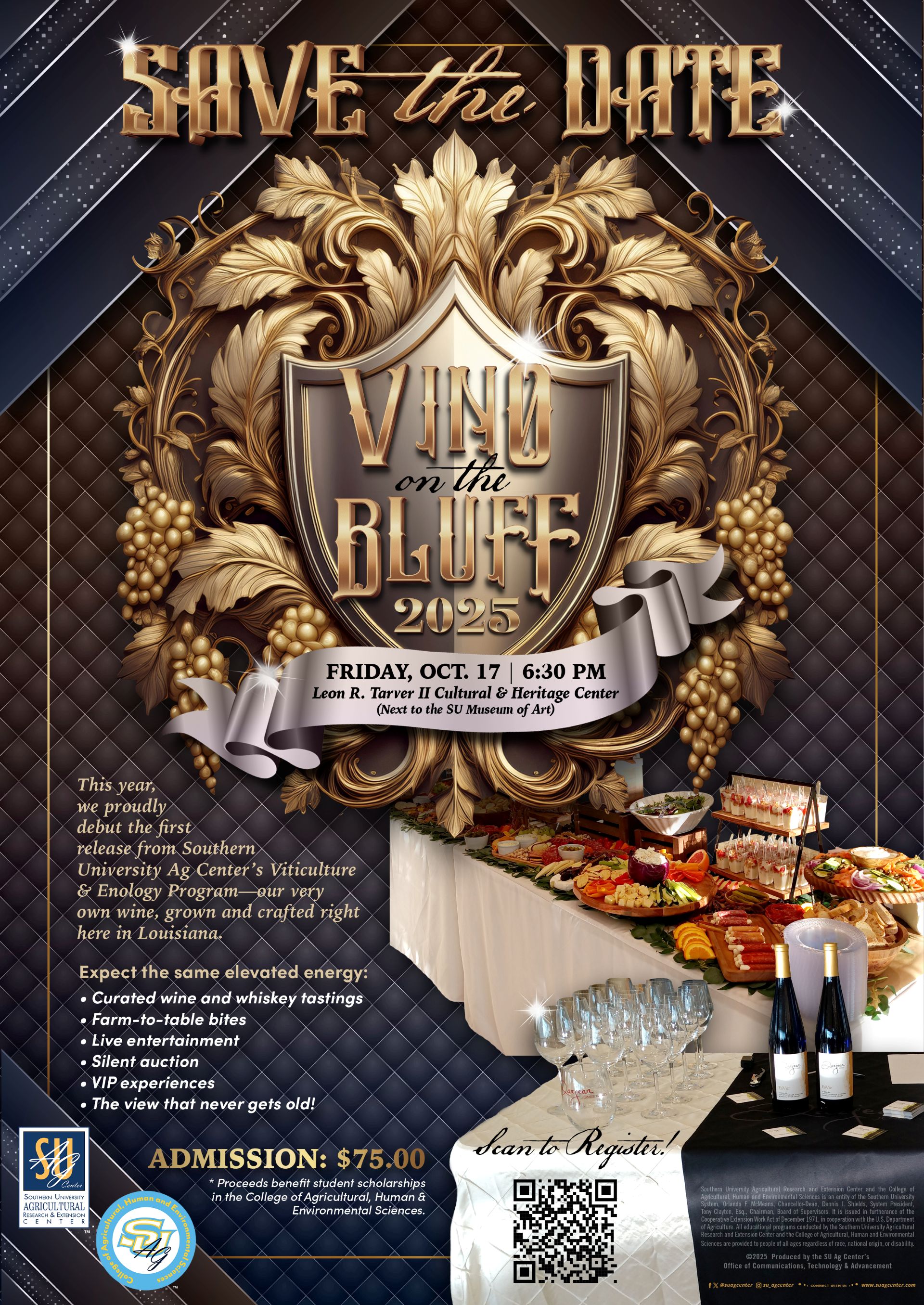 The Southern University Ag Center and the College of Agricultural, Human and Environmental Sciences (CAHES) will host the 4th Annual Vino on the Bluff Wine Tasting Fundraiser at 6:30 p.m. on Oct. 17, 2025 at the Leon R. Tarver II Cultural and Heritage Center, 8320 G. Leon Netterville Dr., on the Southern University campus.